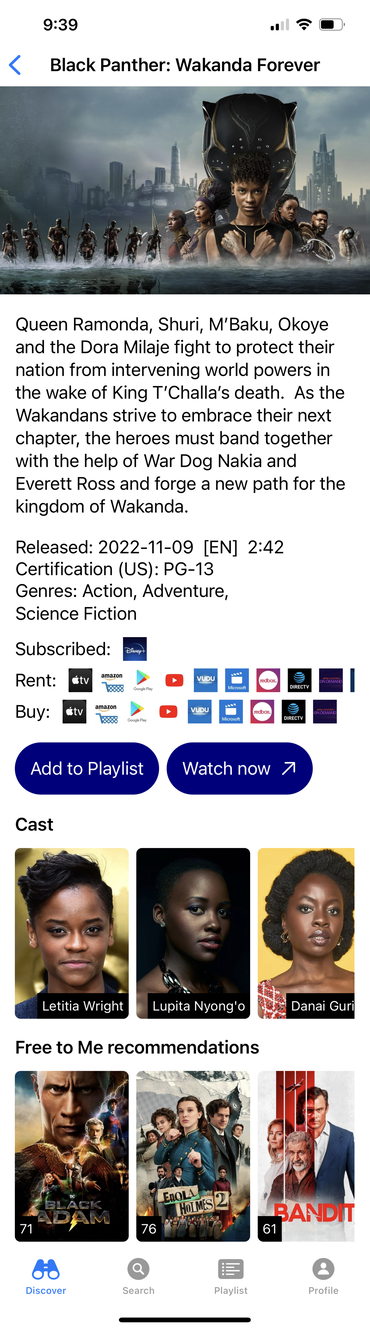 | If you're looking for a show, the app can help you find it across all services. It lists the actors, and gives recommendations from only the services you already have. |